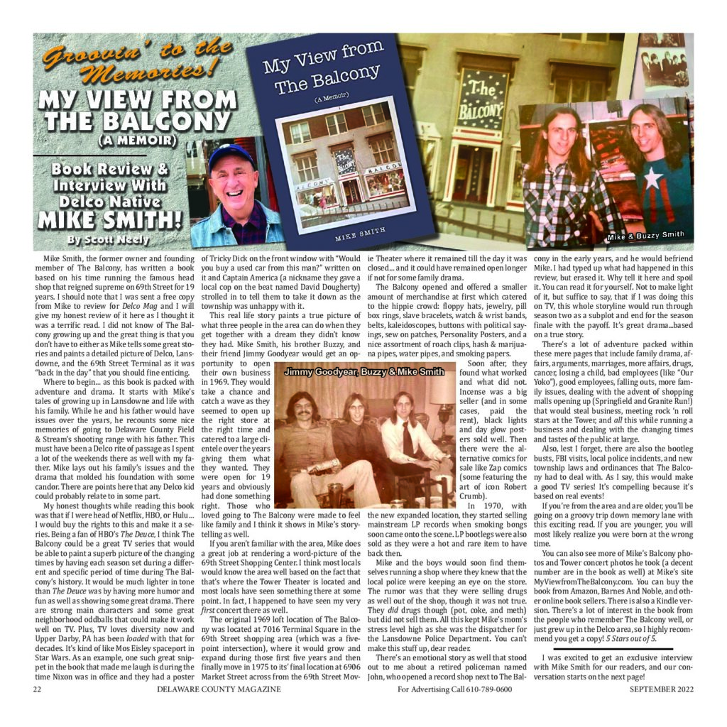 As a gift for my birthday, my wife purchased Mike Smiths ‘My View from The Balcony’ memoir, including a ‘The Balcony’ sweatshirt and tee shirt. All very nice items available for purchase from The Balcony website. I so enjoyed this book! A page turner…hard to put down. A very personal story penned by Mike Smith revealing his 19 year journey, partnered with his brother Buzzy and friend Jimmy… all equal owners, together managing The Balcony, a head shop, from 1969 to 1988. The ups, downs and inevitable problems of trying to keep the partnership fun and profitable all revealed as if you were a ‘fly on the wall’. My wife and I grew up in Upper Darby and have many happy memories of all the places Mike ‘talks’ about in the book. If you lived in the area, it is like a walk back in time. No matter if familiar with the sights and sounds of Upper Darby’s ‘The Balcony’ or not…’My View from the Balcony’ is an entertaining, raw, realistic, gritty, straightforward bitter-sweet memoir recalling the trials and tribulations of three very young men, their business and their personal affairs. Chris Kealey |